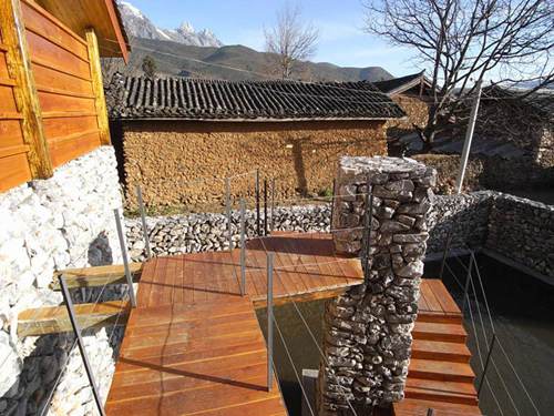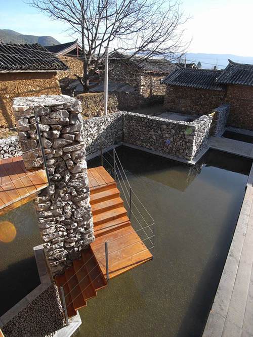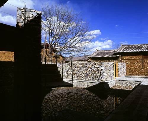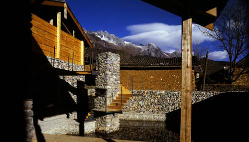基于以山为骨、以水为魄的纳西文化,设计者有意识地将当地材料和元素最大程度地运用到了设计中。并且对于材料的可持续发展的考虑,在设计中大量采用了当地资源丰富的白色石灰沉积岩和卵石,主要使用在石墙和铺地上。由于周围的建筑大多是由粘土砖建成,白色石灰石的运用使得该建筑即卓尔不群,又显得很和谐。