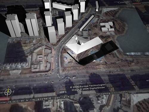 盛大的庆典广场面对着巨大的屏幕柱体,在这里,公众可以最大可能地参与到媒体的制作过程中,它体现了公众对媒体的参与;毗邻朝阳公园的媒体广场则通过绿化植被将两侧的绿色联系在一起,并通过建筑端头的大屏幕营造了变幻多端而又时尚的城市活动空间。两个广场都设置了6m高的灯阵,它们的排列延续了建筑的网格。太阳落山后,灯阵亮起,人们将可以从高层建筑的窗户看到北京城市的巨幅图形在地段内闪耀,灯阵与建筑立面交相辉映,将成为城市一道亮丽眩目的风景线。