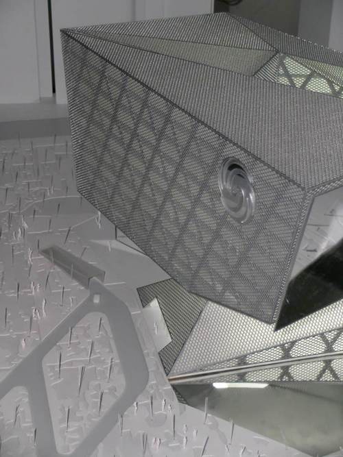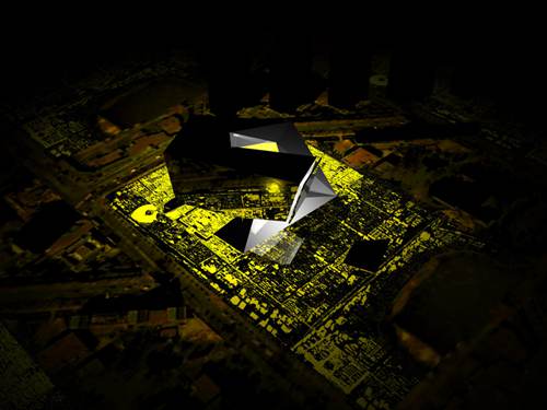 它是一个大型的媒体转换器。通过底层架空,欢迎来自城市四面八方的人们进入,参与到媒体制作的过程中来。它环形的体量代表了媒体制作的生产流线,虚拟的媒体制作过程通过建筑的空间塑造得以表达。矗立的大屏幕向媒体公园、朝阳公园乃至整个北京打开了观看世界的窗口。在这里,城市生活与媒体的对话和联系将会前所未有的活跃。