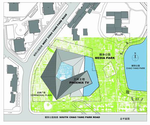 凤凰国际传媒中心基地位于北京东北三环和东四环路之间,朝阳公园的西南角。地段与朝阳公园一衣带水,视野开阔,景色优美,占据了极佳的地理优势。作为媒体产业的明星,凤凰卫视也希望其北京的总部能够彰显其不断创新的企业精神,进而希望以一种新颖的形式对建筑的独特性做出表达。