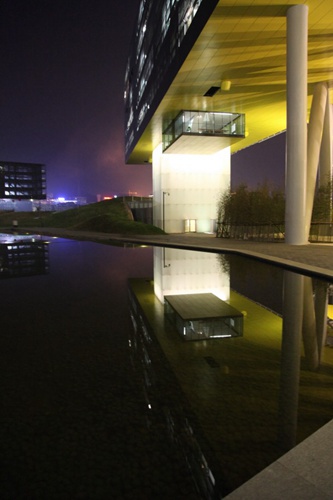 项目的设计概念被解释为“漂浮的地平线”,建筑师将总部多个功能体以水平几何形态连接在一起,并将整个建筑抬起——有如海平面升起,将基地最大程度地还原给自然。根据项目独特的建筑效果(若干巨型筒体及实腹厚墙、落地柱支撑起上部4—5层结构,在底部形成了连续的大空间,落地筒、实腹墙及柱水平距离50—60m,上部建筑端部悬臂15—20m),设计公司提出了世界首创的“斜拉桥上盖房子”的理念。该建筑是一个海啸防悬停架构,创建了一个可渗透的微气候公共休憩景观。下沉庭院、水系、绿地、山丘的完美组合形成丰富的立体景观,使空间最大化开放。