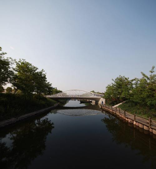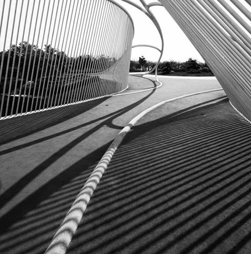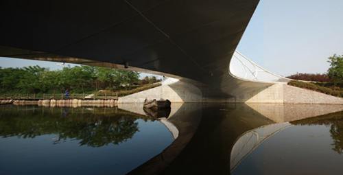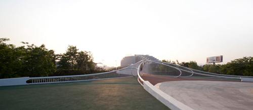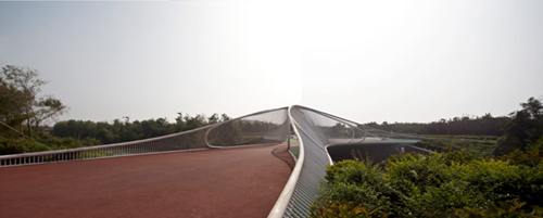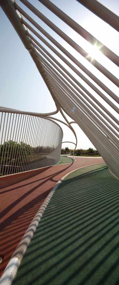 日照步行景观桥位于日照山海天阳光海岸约2公里长的海岸公园南段。山海天阳光海岸自然环境优美,沙滩优良,如何最大程度的保护现存超过50年历史的黑松林成为整个设计的最大挑战。建筑的位置及朝向都经过仔细设计,试图最大程度上的减少对周边环境的影响和对黑松林的保护,由于沙滩宽阔用地相对宽松,建筑在避开黑松林的同时,以草坡逐渐升起的方式将建筑屋顶与环境缓缓相连,使建筑隐于树丛草坡之中。建筑面向大海开敞,在获得海景的同时,在大海与建筑间形成一个半围合的开敞空间,这里的室外泳池为游客提供了优雅的活动场所。