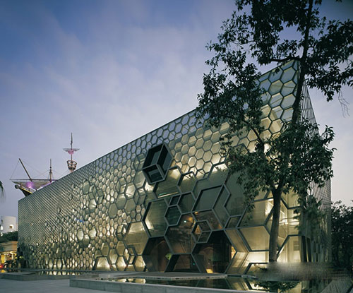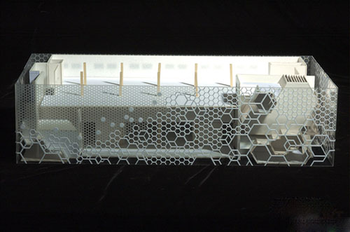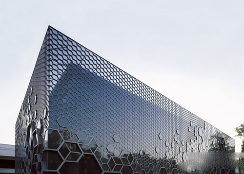 改造策略完整地保留了原建筑立面的窗墙体系,加建的立面通过包裹的手法,将单一的原始六边形通过复杂有机的组合形成由实至虚,由小到大,多层次渐变的三维视觉效果。从而,在车辆由西至东快速通过的瞬间,形成强烈的视觉冲击力,通过立面结构的缩小放大,逐层递减,如同面纱般轻轻揭开,最终透出原建筑立面的戏剧性变化过程。