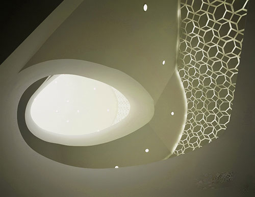 展馆的室内设计再次运用立面所含有的六边形元素作为基本平面形态,在竖向上作90°的拉伸,形成一系列折叠平面互相交叉、互相切入构成的复杂但带着明确功能元素的公共空间。这种表达形式改变了原本单调的立面几何图案,用三维方式生成新的室内空间,这种“突变”形式使设计产生了不可预料的惊喜结果。