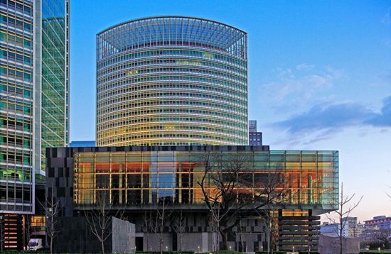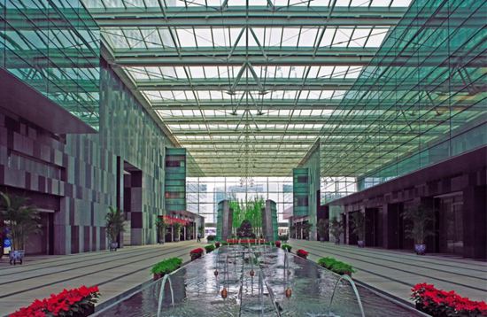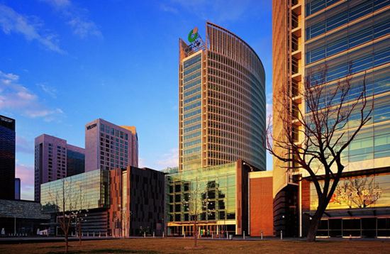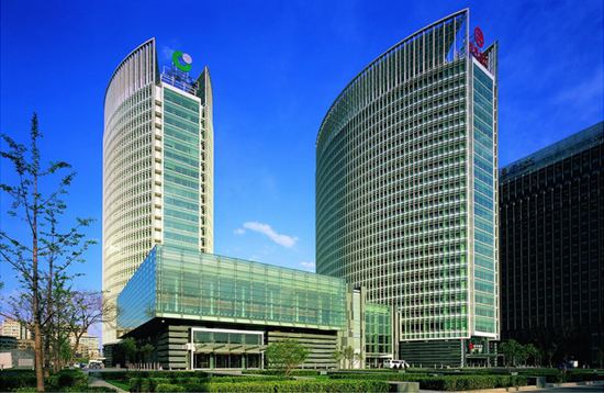 北京金融街直至二环以内最高的地标性建筑,由A、B座办公塔楼(24层)、C座会议中心、D座交易中心、中央四季花园组成。强调城市肌理的有机构成、建筑室内景观一体化和成熟精深的技术细节。塔楼垂直于西二环并前后相错,流线体型与周边的墩实体量形成显著对比。裙楼的石材基座融合庭院风格,四季花园引入生态气息和商业活力,楼冠的玻璃屏风退隐在天色之中。精美的幕墙组合生成微妙的光影,现代而又具有东方传统的神韵。