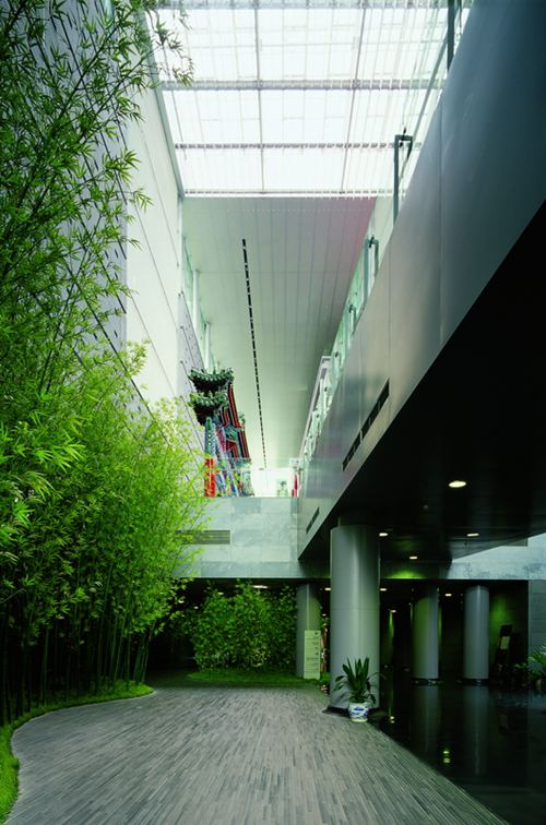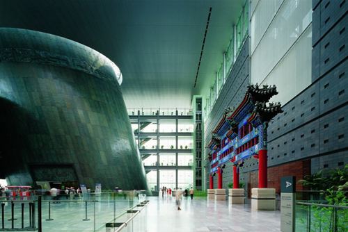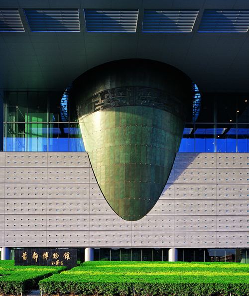 坐落在北京复兴门外大街南面的首都博物馆是京城目前面积最大,功能最全的综合性博物馆之一。其中有两万多平方米的各类展厅,一万多平方米的珍品库房以及各种对外服务和对内管理的相关设施。但是首博的功能定位不仅如此,更是要创造一间“城市的客厅”,以文化的氛围接待往来的友人,于是有了近2000平方米,高38米的公共大厅,巨大的尺度和开放性的空间迎人而入,让人驻足。首博的本土文化特征由地方材料来界定:青铜、灰砖、榆木板、青白石,带着特定的文化内涵,在大跨度的金属屋顶下,出演了一场精彩的历史剧。