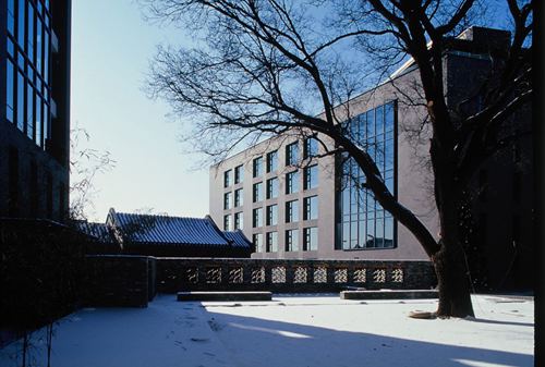 功能分区:地下以车库为主,南侧地下一层出地面部分为餐厅。一层各栋为门厅,部分结合街道形成商业,以上各层为办公。建筑围绕中庭布局,进深不大,利于采光通风。沿主要大街一侧设走廊,办公一侧朝向庭院,减少噪音干扰,创造宁静的办公环境。