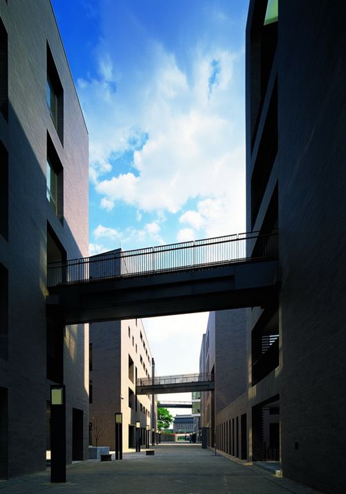 功能布局:地上部分通过街道划分出7个街坊,自然而成7座办公楼,每座建筑院落围合,自成一体,地下通过车库相互连通。部分院落下沉至地下车库,使车库也具有自然光线。