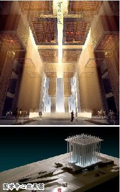 百柱之上,镌刻着中华文化标志性图像与典籍,既象征荟萃四方的思想之林、文化之林,又喻示中华文明屹立于世界之林的伟岸之气。百柱之内,或独立,或组合,或密集,或开敞,虚实之间形成独有之展示性格,百柱阵列,穿越天台,蓬勃生长,象征坚韧不拔、生生不息的民族精神和枝繁叶茂威震四方的中华文化。