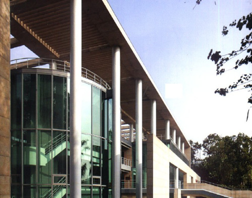 1.每个场地从某种概念上说都是独一无二的,是自然和社会活动相互作用的结果。建筑师有责任使设计同先前存在的场地保持某种连续性。人文馆总体布局及空间秩序的形成,来源于对其所处的宏观环境的理性分析。沿纵向(南北),人文馆置身于校园总体规划南北中轴线关系的控制之下;沿横向(东西),它又处于东、西湖校园生态走廊的中心节点,两套系统的叠合,衍生出人文馆总体有机布局。东湖为一个矩形水体,是华工大校园规划中轴线的景观中心之一,其水面开阔,气势不凡。