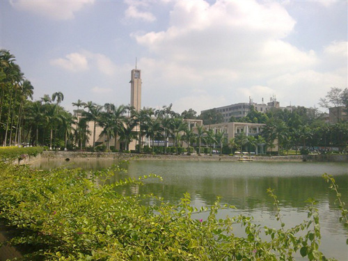 校园许多重要建筑,如:2号楼、27号楼、逸夫科学馆、建筑学院等沿东湖形成工整布局,围合出规整、理性的内向型教学科研中心区。西湖则为一个自然风景湖:水面自由,湖岸曲折,配以湖心岛、白桥、水亭及堆山,构成层次丰富的岭南园林景致。岸线四周,西湖厅、专家楼、西湖苑自成体系,高低错落地散落其间,显得格外自然亲切。从东湖到西湖,是从几何形向自然形,由内向到外向,自有序到混沌,从教学向生活的转换,空间形态与过渡为建筑构思本身提供了一个参照点。为了配合上述空间的节奏,我们在东湖边一侧以规整的平面形式应对历史形成的教学文脉中轴线。西侧则采用较为自由的平面构成,以较小的体量结合园林处理及亲水设计,做到建筑与自然环境的和谐与共鸣。同时为减小对南北两侧道路的压迫感,在建筑南北两侧均退让较多空白做绿化休闲场地。在这里,水池自然转折,并利用地势的变化产生跌水。 韵律柱廊、静止实墙与流动水体相互掩映,相互分割,使室外环境产生片断重叠的效果。退让的空间也使东、西湖湖滨路的视线相交,让校园生态走廊在此得以贯通。建筑主入口处通过12 m的退缩让出方整的叠级水池,延伸了东湖水的诗意,拓宽并加深了入口处的视觉空间。沿入口台阶攀升并跨过水池,穿过景框式的围墙,进入宽敞的中庭灰色空间,透过西侧内院的白玉兰树阵,远处波光粼粼的西湖使视线豁然开朗。视觉走廊的建立,使空间节奏得以自然转换。东西湖景区借助视觉走廊产生的空间对比作用,亦使各自的特点得以升华。