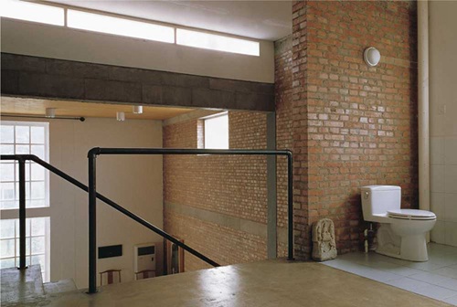 居住部分的前厅空间墙面出现了红砖清漆面墙身、红砖刷白涂料面墙身,灰色涂料面墙身,空间界面的复杂提示了空间的成因,模糊了空间的整体性;同时两层空间的区域比前厅部分高出一个侧天窗高度,反而与工作室的楼面高度齐平,从剖面上更削弱了居住空间自身的统一。工作室进入居住空间部分的灰色涂料墙面以及与前厅高度的一致从材料和剖面上提示了居住和工作室之间的关联。