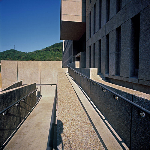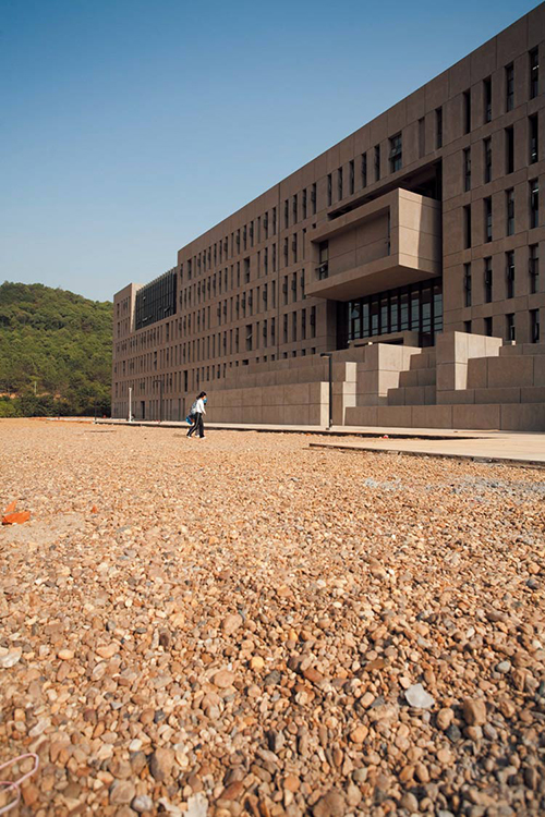 项目为学校天马山新校区南端首期启动部分。由于地处岳麓山国家风景名胜保护区外围控制区,建筑何以与环境共生是焦点问题。建筑采用线型体结构,以“侧身”形态偏居南端,最大限度避免对天马山主景区山体的遮挡,并作为山体视觉延展的新的部分。