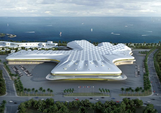 建筑主体采用一体化的设计手法,将展览中心和会议中心整合处理为一个巨大的完型体量,匍匐在南中国海滨,成为城市南北向景观轴线的结束与高潮。作为新城中心区轴线的底景,这一庞大的建筑有着明确的、与新城中心合一的轴线,同时又因地形、海岸和内部功能而产生了丰富的非对称建筑形体,成为在规则韵律中富含变化、整体造型协调统一的一个巨型建筑体。建筑造型是处于“像与不像”之间的抽象人工物。“海水”、“云团”、“沙滩”、“海洋生物”、“海上景象”……似是而非,但总与大自然海洋气质相契合。规律起伏波动的屋面壳体钢结构由等截面的密格式布置的圆形钢管梁(中部区域)和钢网架(边缘区域)组合而成,以工厂预制、现场组装、吊装就位的方式建造,既塑造出独特的建筑外观,也与室内空间高度统一,并营造出适应不同规模和使用需求的展览和会议、休闲、服务空间。壳顶单元的天窗和高侧窗为室内空间提供了充足的、不断变换角度的自然光线。环绕整个建筑外侧的半拱形檐廊、雨棚及其下结合窗台设计的“石凳”,是应对当地强烈的日晒条件,为室外的使用者提供的遮阴和休息设施。