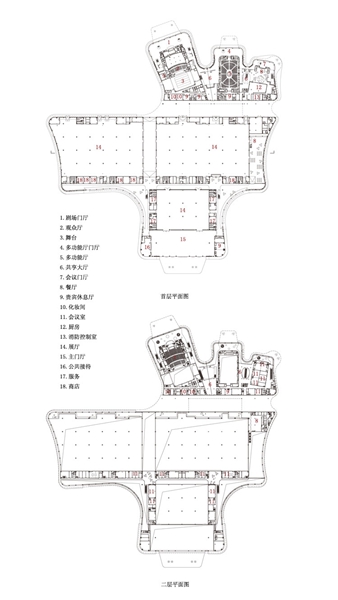 采用的建筑材料有石材、曲面铝板、现制GRC 及屋面涂料等。大部分室内钢结构完全露明,呈现出结构自身的美感和韵律。