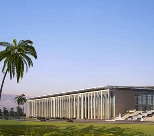 阿尔及利亚奥兰会展中心是传统与现代建筑的完美融合。作为一个商务场所,会展中心和一座城市的骄傲,它代表了所在城市的历史,同时也寄托了城市的梦想和希望。在功能方面的高效和设计的厚重感平衡了商业和美学,历史和艺术。建筑外部简洁的形状与精心设计的光影效果构成对比。重复的几何形态有助于各个区域间的过渡,构成了一个关于阿尔及利亚传统与现代相包容的缩影。八角星,一个在阿尔及利亚常见的设计元素,从醒目的“第五面外观”的屋顶天窗,到走廊上精致的框架,它的变体到处可见。