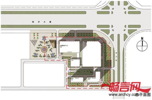 项目设计从城市规划的角度考虑,结合用地形状、交通流线及与周边建筑的体量关系,形成了北侧郑开大道—城市缓冲区—金融中心主体—休闲庭院—配套区—南侧其它项目居住功能的城市层次。由相邻的城市广场和半私密内部庭院形成的开放空间划分商业、商务和配套功能区域,又成为高密度建筑组群中的缓冲空间,结合商业顶层的屋顶花园,和超高层写字楼内的多个生态舱,形成丰富的立体绿化。