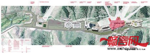 本项目建于山区,地形高差复杂,建筑设计顺应地势,设计了不同标高、不同大小的广场、露台、庭院,减少了工程的土方量,同时形成了丰富的室内室外空间,使室内外空间自然渗透。建筑立面采用大面积落地玻璃窗与文化石、仿古砖饰面的虚实对比,屋顶采用金属坡屋顶,极具山地建筑的特色。