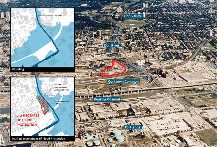 Corktown Common防洪公园是一个城市公园,成为将城市公园设计与城市防洪结合起来的典范。这个生物多样化的公园种满安大略省本土植物,其地下是一个4米高的泥土下层结构,重塑顿河的泛滥平原,去除多伦多后工业West Don Lands潜在的洪涝危机,让洪水朝南流向湖泊。