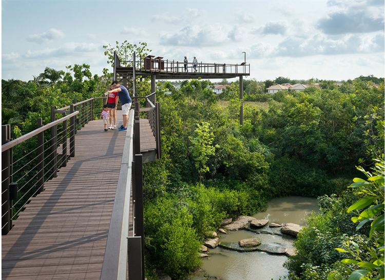 在树冠水平上,最佳密度的植被以及维持这种密度对幼苗的茁壮成长很关键,同时也提供足够的冠层截留减少径流,用于雨水过滤。现场雨水的过滤会填充护堤内的地下水。当人们横跨空中走廊和观景台下面的小径回到展览中心时,森林中的扩散树冠会为游客提供阴凉。