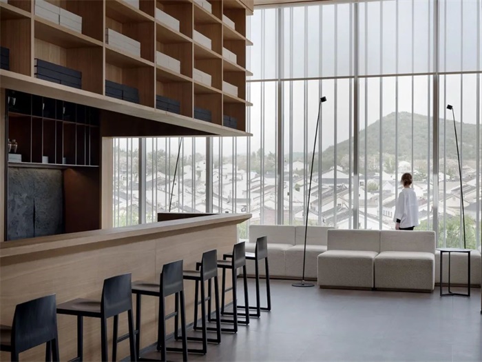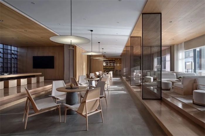 设计师设计的生活艺术休闲廊是项目商业街中的三层建筑。室内空间以幸福为理念,借鉴了汉代的深厚文化和周围山水的魅力。以现代手法传达东方人与自然合一的理念。空间的结构强调了中国传统的仪式秩序概念,这是通过元素有节奏的分层推进来完成的,从而在每一步都为游客呈现不同的视角。少即是多的概念也是一个关键组成部分。空间设计与自然的整体主题一致,具有简约、宁静、纯洁和优雅的感觉。