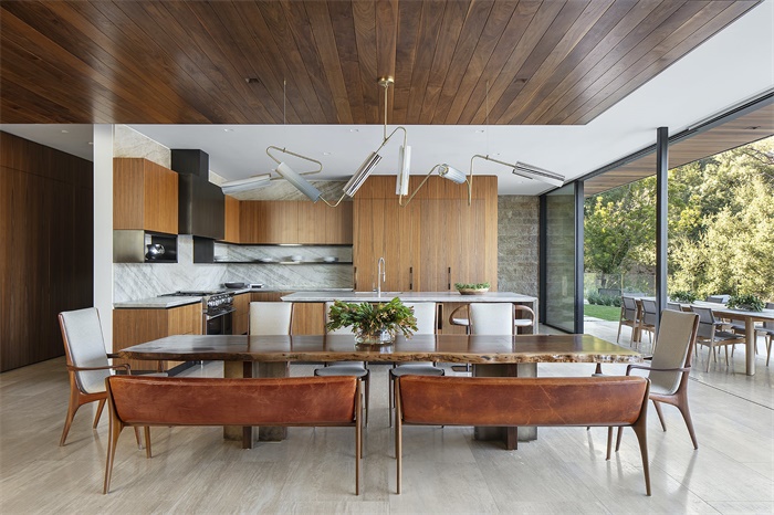 San Remo住宅坐落在加州帕里赛德沙利文峡谷陡峭的山坡上,向北排列成一列,盖蒂山全景视野尽收眼底。房屋由两个石灰岩基座上的垂直、水平体量组成。在峡谷中茂密丛生的原生植物群中,木材和钢铁的垂直线条勾勒出住宅建筑的轮廓。