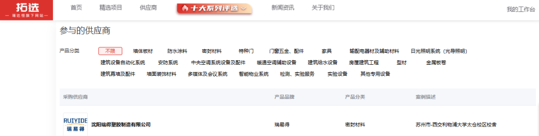 作为优质建筑项目案例、建材展示平台,“拓选网”可帮助对标同类型项目,寻找优质供应商资源;对比成功项目案例,评估供应商实力。