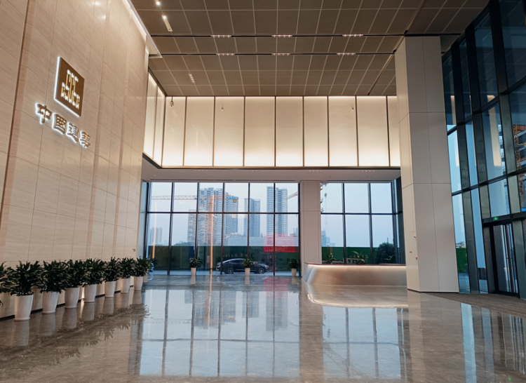 大厦隔墙和地坪施工采用了自主研发的磷石膏基材料,可减少施工过程中的碳排放,助力绿色建造。
