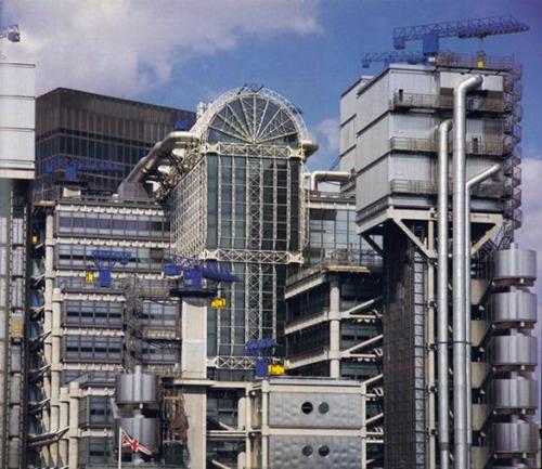 伦敦的劳埃德大楼(Lloyd’s Building)是Richard Rogers继蓬皮杜中心后设计的又一座结构表现主义建筑,展示了类似的“内外翻转”的形象并结合了罗杰斯标志性的表现主义风格的建筑手法。