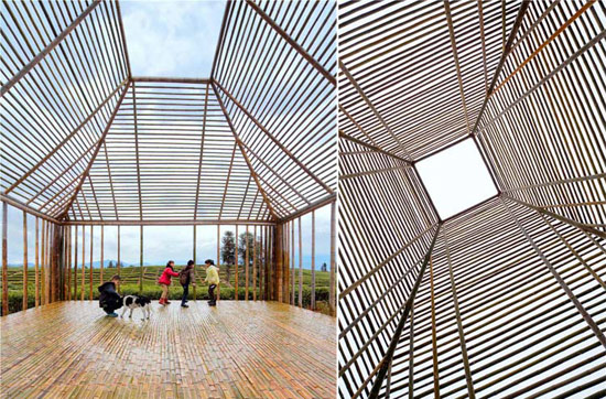 松阳盛产的竹子作为建构材料,可以减少对茶园生态环境的影响,用料环保,结构轻盈简洁,震害轻,施工速度快。结构体系采用直径100~120mm的毛竹。四角脊线竹龙骨加上顶部口字形结构单元形成的基本屋面结构,辅以四坡面顺坡面次竹龙骨形成大大小小稳定的三角形单元,共同组成一个稳定大跨越空间屋面体系 ;墙身系统由竖向布置的柱龙骨组成,其布置四角到中间由密至疏的渐变既反映了受力变化趋势,也节约了用材。