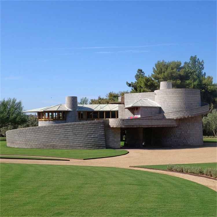 赖特使用了厚重的预制混凝土块来建造这座别墅,在桉树浓荫与茂密植被掩映之下,混凝土的工业性被转化为类似于石头的天然性,米拉德住宅仿佛是丛林中不知何时建造的古代庙宇。很难让人相信的是,这个别墅居然位于美国人口最为稠密的加州帕萨迪纳,不远之处就是著名的玫瑰碗体育场。赖特对米拉德住宅格外偏爱,他非常清楚这个建筑背后的价值:“最终,这个小住宅中开始了一种真正的建造方法i这是建筑的‘编织’,任何人都不会用错;这里有自然对做作、虚假或者是无知狂妄的拒绝。也正因为如此,赖特声称,如果需要选择的话,他宁愿设计米拉德住宅,而不是罗马的圣彼得大教堂。