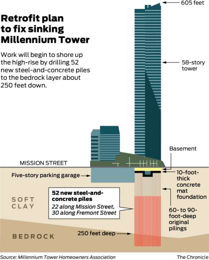 2016年8月,《旧金山纪事报》(San Francisco Chronicle)披露了一系列关于千禧大厦地基下沉、亟待修复的消息。家住大厦42层的Dodson夫妇凝视着对面旧金山跨海湾交通枢纽(Transbay Transit Center)的施工场地。根据开发商Millennium Partners的说法,毗邻大楼的交通枢纽建设造成了地下水位变化,导致地基沉降。