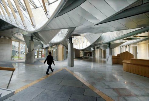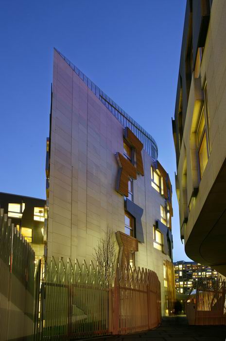 看起来埃瑞克-米拉莱斯已经设想了一座政治和诗歌得以结合的建筑。EMBT/RMJM(Enric Miralles Benedetta Tagliabue with RMJM) 以充满智慧与众不同的方式将陈旧的认识和学者的等级制度或者故作姿态的评论员苛刻的要求重新组织,创造出了包容了市民时间和智慧的东西。这座建筑的建造伴随着大幅超支的预算和无能的政治,还需要一定时间才可以参观。同时它也需要很长的时间才能被理解。这里没有直接明了的视觉印象,也没有虚伪的标志性的视觉大餐去满足建筑Munro bagger的贪得无厌的欲望。