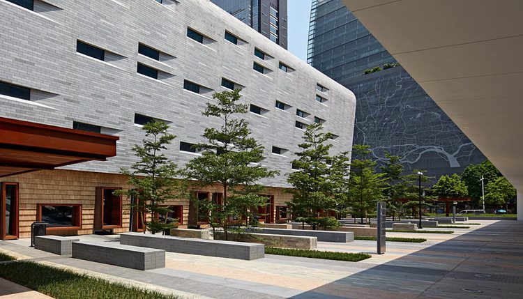 公众访客经由场地东侧的门楼进入领事馆。这座低层建筑的外壳优雅高效,以土褐色耐候钢包覆,安保人员就在建筑内执行必要的安检手续。