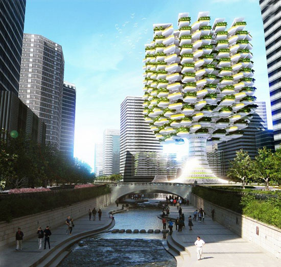 首尔skyfarm垂直农场由aprilli设计工作室设计建造。农场将建在韩国首都首尔市中心,毗邻清溪川广场,坐落在城市人流量最大的繁华市中心,这座高大的垂直农场能够为本地提供最新鲜的蔬菜供应,同时改善城市的环境质量,净化污浊的城市空气,生产可再生能源。树状的结构异常明显,是可持续发展的标志,也成为了当地的新地标。