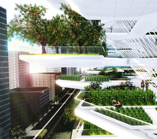 垂直农场基座像一棵“巨树”,由四个主要组成部分组成:树根、树干、树枝和树叶。巨树”底层的环境多为可控的,为各种素菜果树的种植提供多种条件。在升高作物的种植环境之后,蔬菜能够获得更多阳光与空气的补给,并减少底层公共空间的占用率。