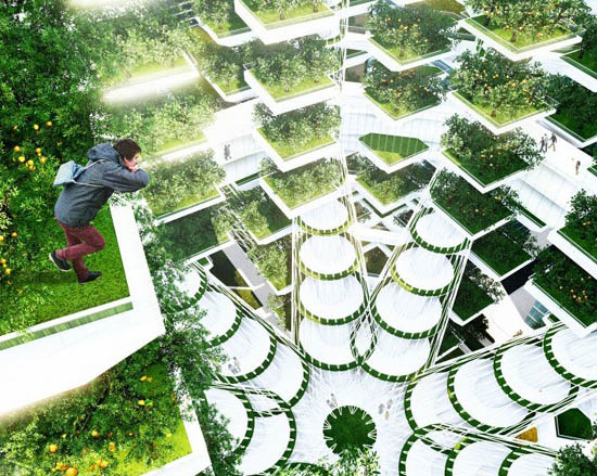 垂直农场完全属于一座生态环保建筑,利用清洁可再生能源进行自身的能源供应,拥有能够利用太阳能的光伏板,在白天,光伏板产生能量,并用于夜间照明和供暖。垂直农场是一座具有生命的建筑,它通过净化水体和空气来提升环境质量,城市高密度的发展也将通过这座建设的绿色空间从而降低城市中心热效应,减少地表雨水径流和二氧化碳含量而从中受益。