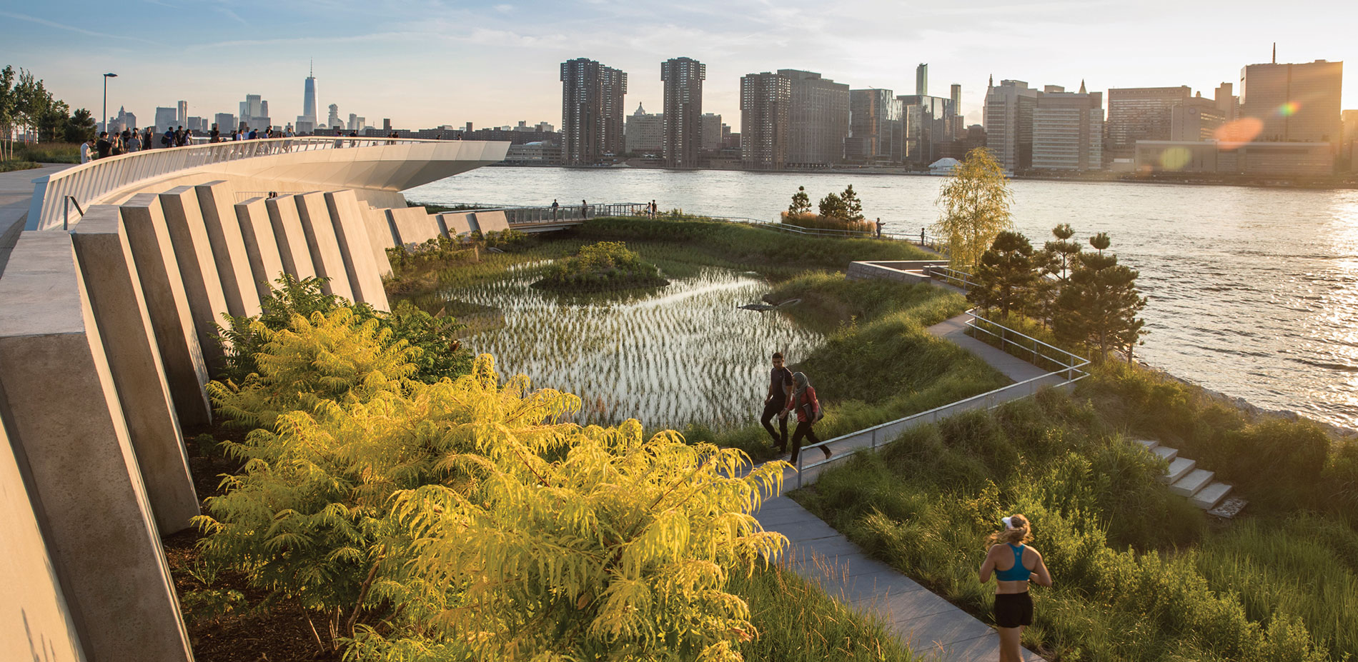 利用水,治理水,控制水,是景观设计师的任务。纽约长岛亨特角南海滨公园就是一例,为防止东河洪水泛滥和水位上升,利用其丰富的历史和壮观的景观来建立多层次的娱乐文化目的地和环境栖息地。
