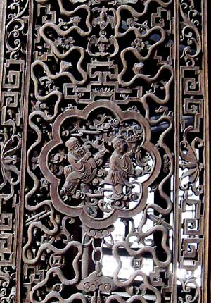 中国古代建筑以梁柱木结构为主,墙一般不承重,所以廊柱内柱与柱之间一般安装格门或格扇代替墙面,多为六扇或八扇,既通风、采光、装饰,又与外界隔断。古代建筑物较高,所以格扇造型也窄而高,细长高挑,如苗条淑女,故人们形象地称格扇中间的条环板为腰板,束腰以下为裙板,颇为拟人化。上部的格心有直棂和菱花两种,纹饰有正方、斜方格眼、万字流水纹、品字回纹、蜂窝纹、球路纹等,有的开光雕人物、花卉。玲珑剔透,繁而有序;腰板和裙板多以浮雕装饰,或雕刻人物故事,如三国故事、大船称象等,或山水、花卉、动物,如八骏八鹿、博古图等,人物或须发毕现,具体而微,或厮杀混战,生感动人,或醉酒赋诗,佯狂颠倒,均表现得淋漓尽致;花卉纹花瓣翻卷有致,花叶抑扬纷披,自然生动。