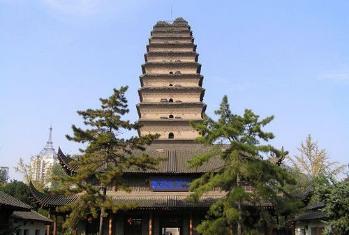 小雁塔在陕西西安市南约1公里处的荐福寺内。寺创建于唐文明元年(公元684年)。初名献福寺,是为唐高宗献福而建立的寺院。塔修建于景龙年间,因比慈恩寺大雁塔小,故名小雁塔。塔身为密檐式方形砖构建筑,初为十五级,后经多次地震,塔顶被震坍,塔身破裂,现余十三级,塔基座亦呈方形,塔底层每面长11.83米,通高43米。型体秀丽美观。
