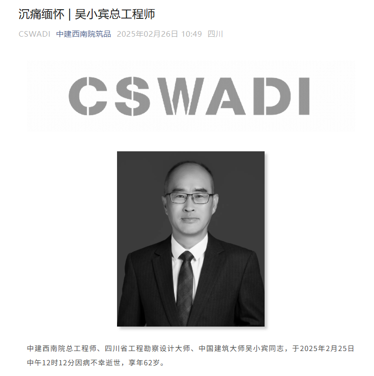 中建西南院总工程师、四川省工程勘察设计大师、中国建筑大师吴小宾同志于2025年2月25日逝世,享年62岁。吴小宾同志1963年7月出生于贵州贵阳,籍贯四川简阳,清华大学学士,重庆建筑工程学院硕士。主持完成了重庆江北机场T3B航站楼、青岛胶东国际机场航站楼、乐山奥体中心、西昌川投中心医院、中海成都天府新区489米超高层项目等一大批重大工程项目,获省部级以上及重要协会学会优秀设计奖50余项。