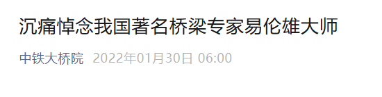 全国工程勘察设计大师、中国中铁股份有限公司特级专家,中铁大桥院副总工程师易伦雄同志于2022年1月28日逝世,享年 56 岁。易伦雄同志主持设计了我国桥梁建设的第六座里程碑——京沪高铁代表性工程南京大胜关长江大桥,以及世界最大跨度三塔铁路斜拉桥洞庭湖特大桥等十余座具有国际先进水平的特大桥梁工程。在桥梁钢结构及桥梁结构钢领域研究深入、业绩突出,先后获得国家科技奖2项、省部科技奖10余项。