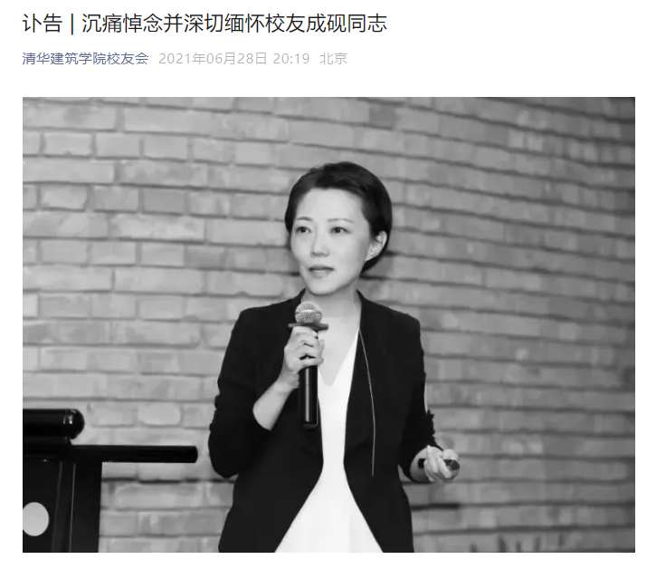 北京城建设计发展集团副总经理成砚于2021年6月27日下午逝世,享年47岁。成砚同志于1992年考入清华大学建筑学院,先后获得建筑学学士学位、工学博士学位;是学院历史上首位清华大学特等奖学金的女性获得者,曾荣获清华大学优秀毕业生等荣誉称号。曾任北京奥组委工程部规划设计处项目主管、场馆管理部竞赛场馆一处副处长、处长等职务,为2008北京奥运会场馆建设和管理做出了突出贡献。