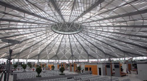 上海南站30米高的候车大厅,有69万立方米空间,采用了集中供冷的中央空调系统。当初在设计时,设计师将30米高的空间进行了“虚拟的分层”,将空调安装在只考虑人体感受到的2米~2.4米的空间,2.4米以上空间的热气则由屋顶的9台风机进行抽排。