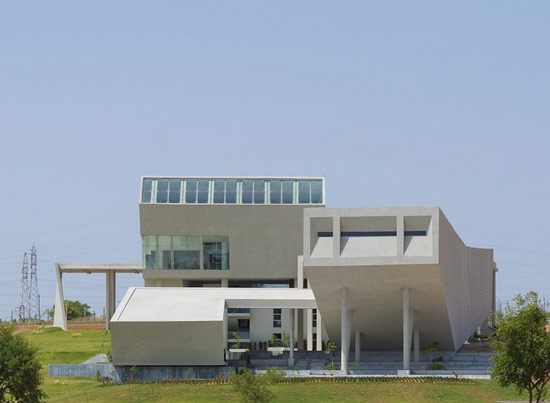 由此形成了棱角分明的剖面几何形态,仿佛从地景中突出出来,好像高速公路沿线的大圆石。图书馆利用这一点有效地将北部光线引入空间内部。东面和西面被看做是实体表面,降低热渗透深度。坚实的混凝土体块用石膏和涂料渲染,营造整体感。地板材料选用当地的粗糙饰面的花岗岩,个别单元中选用抛光石材或木材。