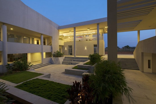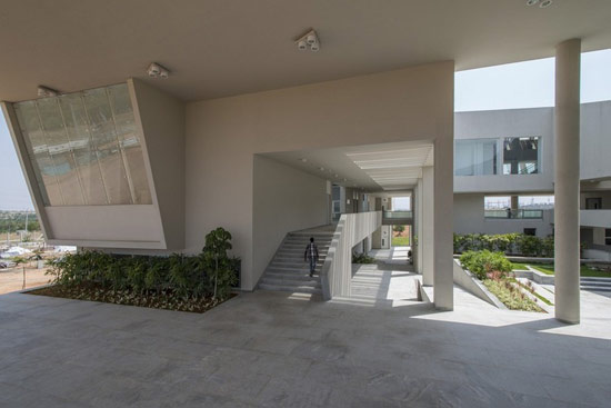 项目沿南侧最高的边缘分布。设计意图是参考倾斜的地形,以一种有结构有组织的方式利用地形。项目被划分为两部分,两者中间形成开放空间。这有助于将项目单元分化成行政区和学生区两部分。行政功能单元位于东部,教室位于西部。经过调整,两部分在西南和东北区域分别形成了空间。员工房间和图书馆被容纳在折叠的空间内。学生休息室位于两者之间,俯瞰学生庭院,赋予了图书馆以独特的个性。部分学生空间被减去,旋转后形成一个形象更加鲜明的学生场地。旋转部分还被看做是行政教室。设计中还引入较小的场地为教室提供采光和自然通风。