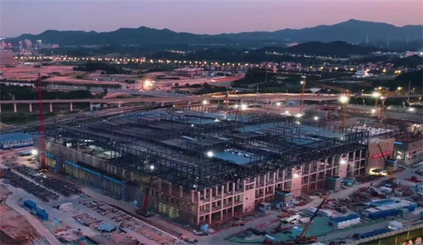 项目现场坐落于广州市黄埔区中新知识城,由中国电子工程设计院世源科技工程有限公司承担EPC总承包。工程全面采用盘扣架体体系,以科学应对万吨级高支模荷载。面对跨度达52.8米、重量约1368吨的大型钢结构,项目团队通过预设超千米滑移轨道和计算机同步控制,实现了重型构件的整体精确安装。