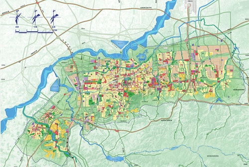 中心城空间结构:中心城空间结构为“一城两区”。“一城”为主城区,“两区”为西部城区和东部城区。主城区由腊山、党家、旧城、燕山、王舍人和贤文六个片区组成,规划重点是优化用地结构,调整和强化政治、经济、科技和文化中心功能,并发展会展、体育、物流等新兴服务业。