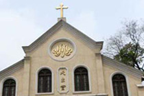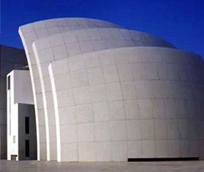 三片白色弧墙,如船帆状。教堂高57~90尺不等,如船帆状的三片白色弧墙,层次井然地朝垂直与水平双向弯曲,似球状的白色弧墙曲面。建筑材料包括混凝土、石灰华和玻璃。