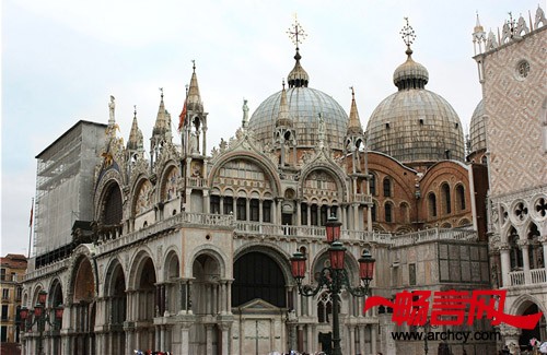 圣马可教堂由于其中埋葬了耶稣门徒圣马可而得名。圣马可是圣经《马可福音》的作者,被威尼斯人奉为护城神,其坐骑是狮子,当威尼斯摆脱拜占庭的控制,成为一个城市共和国后,元老院决定圣马可为城市的新守护神,以代替狄奥多尔,所以威尼斯的城徽是一只巨大的狮子抱着福音书。圣马可教堂不仅也是一座教堂而已,它是一座非常优秀的建筑,同时也是一座收藏丰富艺术品的宝库。它融合了东、西方的建筑特色,它原为一座拜占庭式建筑,15世纪加入了哥特式的装饰,如尖拱门等;17世纪又加入了文艺复兴时期的装饰,如栏杆等。从外观上,它的五座圆顶据说是来自土耳其伊斯坦堡的圣索菲亚教堂;正面的华丽装饰是源自拜占庭的风格;而整座教堂的结构又呈现出希腊式的十字形设计,这些建筑上的特色让人惊叹不已。中间大门的穹顶阳台上,耸立着手持《马可福音》的圣马可雕像,6尊飞翔的天使簇拥在雕像下。入口处的上部有4座青铜马像(复制品),真品现在收藏在教堂内,这是公元前四世纪的青铜驷马,威尼斯人在1204年掠夺自君士坦丁堡,虽然曾被做拿破仑带回巴黎,但后来又回到了威尼斯,在圣马可教堂的博物馆内可见到它们的踪迹。圆形天花板上的镶嵌画是从圣经旧约全书中取题的。教堂的正面五个入口及其华丽的罗马拱门是陆续完成于十七世纪,在入口的拱门上方则是五幅描述圣马可事绩的镶嵌画,分别是“从君士坦丁堡运回圣马可遗体”、“遗体到达威尼斯”、“最后的审判”、“圣马可神话礼赞”、“圣马可进入圣马可教堂”等五个设计师主题,金碧辉煌非常的耀眼。右边洗礼堂的镶嵌画也很美丽。Pala d'oro是代表这座寺院的珍宝,制作于976年,其后经过修补,镶有宝石等,非常漂亮。寺院右端有珍宝馆(Tesoro),陈列在1204年十字军从君士坦丁堡带回来的战利品。接下来,还可以见到内部丰 富的艺术展品收藏品,这些收藏都是来自世界各地的,因为从1075年起,所有从海外返回威尼斯的船只都必须缴交一件珍贵的礼物,用来装饰这间“圣马可之家”。教堂的内部,从地板、墙壁到天花板上,都是细致的镶嵌画作,其主题涵盖了十二使徒的布道、基督受难、基督与先知以及圣人的肖像等,这些画作都覆盖着一层闪闪发亮的金箔,使得整座教堂都笼罩在金色的光芒里,教堂又被称之为“金色大教堂”。 教堂内殿中间最后方的黄金祭坛,祭坛之下是圣徒马可的坟墓。祭坛后方置有高1. 4米、宽3. 48米的金色围屏(Pala d'Oro),屏面上有80多幅描绘耶稣、圣母、门徒马可行事的瓷片,在这个画面上共有2500多颗钻石、红绿宝石、珍珠、黄玉、祖母绿和紫水晶等珠宝来装饰;中央的圆顶是一幅耶稣升天的庞大镶嵌画,是由一群威尼斯非常优秀的工匠在十三世纪所完成的。这座伟大的教堂在1807年之前一直是威尼斯总督的私人礼拜堂。